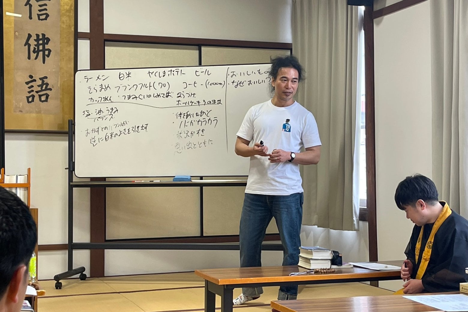 さて、講演は受講生たちによる念仏の唱和で始まり、普段の大学での授業とは全く違う雰囲気を味わわせていただきました。講演の内容としては、「人生で一番美味しかったものは何か」という問いを出発地点とし、さらに「なぜそれは美味しかったのか」と問いながら、「事象の真の原因は何か」、「価値は人それぞれか」、「普遍的なものは実在するか」といった哲学的テーマへと掘り下げていきました。受講生は設定されたテーマ自体からは抽象的で難解な印象を受けたようですが、自分たちの具体的な経験をグループごとにワイワイと語ってもらいながら進めていきましたので、全体として活発に意見や冗談が飛び交う明るい雰囲気のもとで時間が過ぎていきました。